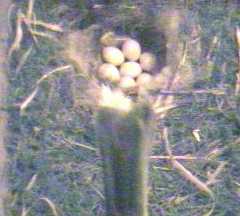 The books say that sometimes the shell is eaten, and sometimes it is removed from the nest and dropped outside. In all the egg hatchings that we have seen, the hen bird has eaten at least the first few eggshells. Producing such a large amount of calcium to make the shells for a clutch of eggs must place an enormous burden of the hen's body and it is little wonder that she takes every opportunity to replace that calcium as soon as possible.