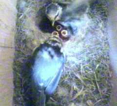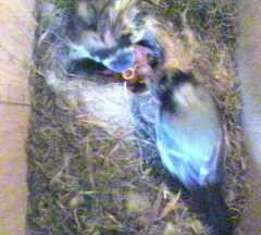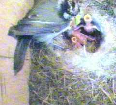 Flash brings some food for the chicks. Four despairing gapes as mum goes off to hunt for food.