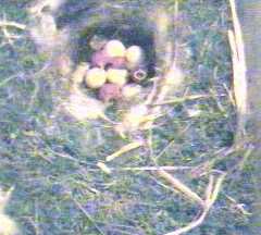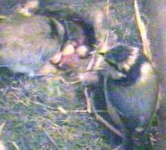 There are now only 5 eggs, and therefore, presumably, 3 chicks. Fred looks on anxiously while Fantail checks them.