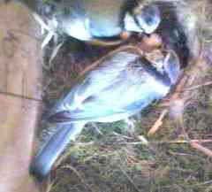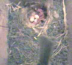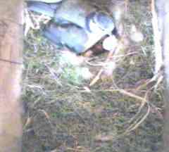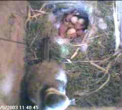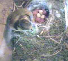 Back to Box1 then - and what do we see, but Fantail holding a large piece of eggshell in her beak! It's two days since the first four eggs hatched - what chance is there for this little scrap? Two days may not sound much - but the time between hatching and fledging is only about seventeen days.