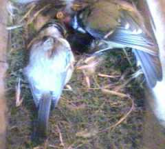 Some time back, we wrote about how to tell the sex of bluetits. At the time, we felt that Fantail broke the rules and had the broad white band across the back of her head that we felt was characteristic of male bluetits. Here are a couple of pictures of Fred and Fantail standing in roughly the same position. We reckon that Fantail no longer looks like a male!