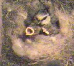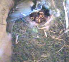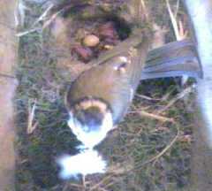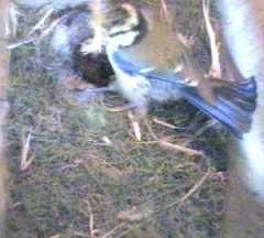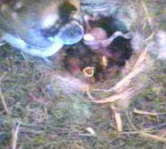 There are a couple of mileposts that the chicks are now reaching. The first is that they start cheeping and the second is that their eyes open. So far only Fluffy's chicks are cheeping strongly, although we fancied we heard one of Fantail's chicks making cheeping sounds today. Now we have a picture of one of Fluffy's chicks with an eye open. Soon they will be able to do more that stick their open beaks as high as possible to attract food. (The picture is dark because a bird was on its way out.)