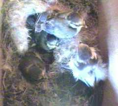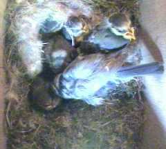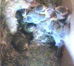 On the right, the chick standing on the floor of the nest looks almost as big as Fluffy herself.