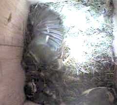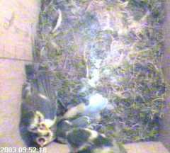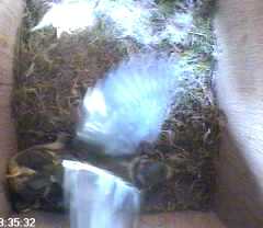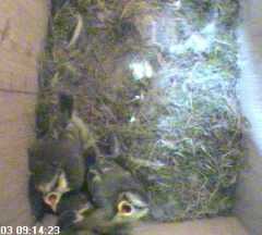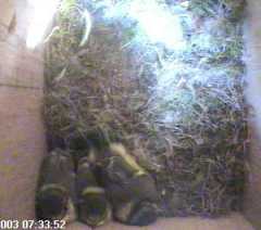 Friday started with three subdued little chicks huddling together for comfort. Quite often one chick gets buried and more than once we have thought that another chick must have fledged, only to find it reappearing from beneath its sibling a few moments later. At first we thought that this was a fight for supremacy, but after watching them for a while it is clear that if they are fighting at all, it is to be at the bottom of the heap!