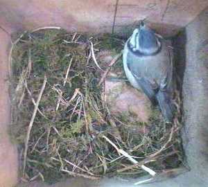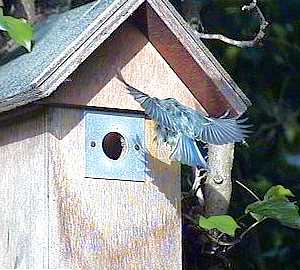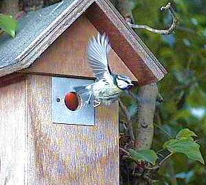 In this picture Barney, who has been perching on the nest box hole, pops up to land on the roof.
