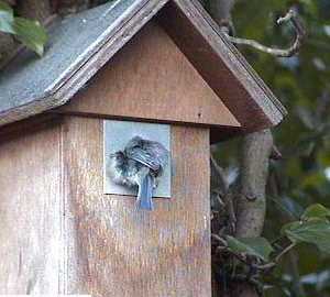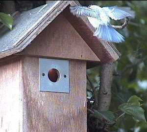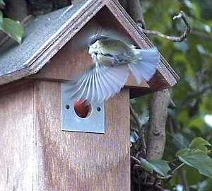 This is another of Barney's vertical take offs. He had been perching on the nest box hole and wanted to fly up to the roof. He jumps up and gives a quick flap - and he's there!