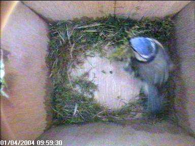 You can see some of it is still stuck in the entrance hole. It was still there 10 seconds later but vanished shortly after while Fluffy was still messing about inside the box - blown off by the wind, perhaps.