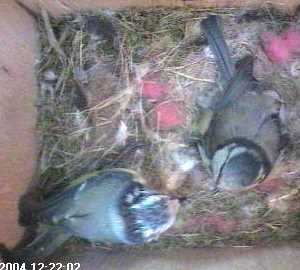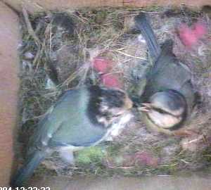 This image was the start of the most extended 'kissing' session that we have seen between bluetits. At about 12.22 Barney came into the nest when Fluffy was already in it - a most unusual thing for him to do.