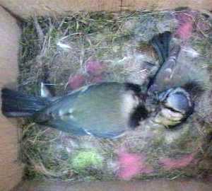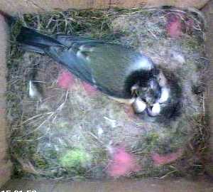 This time Fluffy's got him confused. Barney has come in with some food but Fluffy is not there! He checks the nest thoroughly just in case one of the eggs has hatched. Finding there is nothing to feed, he departs.