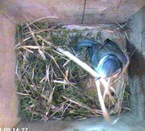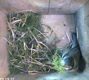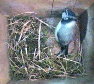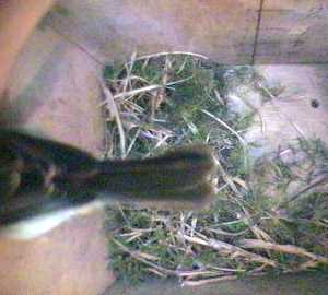 As she leaves the box for the last time today, you can see that she doesn't seem to have made much difference to the amount of nesting material!