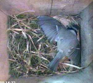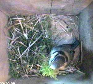 She's still preoccupied with this spot on the nest box wall.