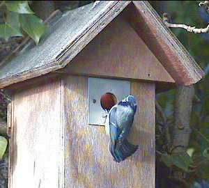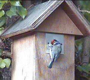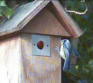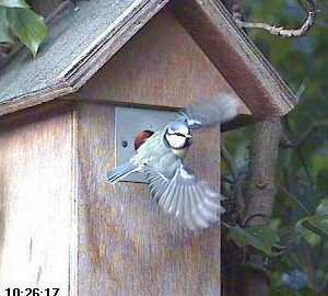 Here's Barney coming into land on the nest box hole. You can see from his posture - he is leaning well back - that he is not intending to go straight into the box.