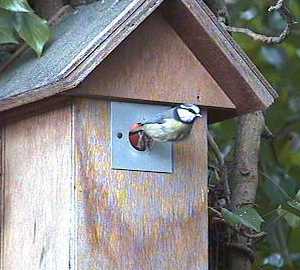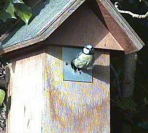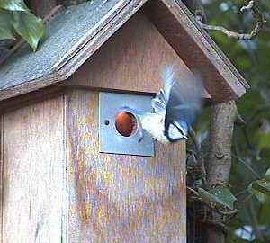 This is Barney. He is doing a vertical take off from the nest box hole in order to land on the roof directly above.