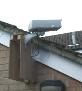 Another drizzly day. However, the camera housing has now arrived together with some cable to connect it to our computer. The problem is that the camera cannot be fitted directly onto the end wall of the garage, as the eaves of the garage roof get in the way of a direct view of the nest box. We have to construct some sort of bracket to enable the housing to be mounted with sufficient clearance and height so that the camera can look over the roof towards it, unobstructed.