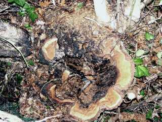 Looking at the stump, it is surprising that it survived as long as it did. It shows a large rotten hole surrounded by a thin layer of dead wood. The stump, shown on the left, shows that the tree was about 2 ft in diameter before it fell, but that most of this was hole!