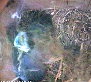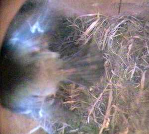 The poor picture quality is due the the spiders' webs which are across the inside of the box. This evening, I must go and clear them away - it would be just our luck if a bird started roosting in the box before it had been cleaned of cobwebs!