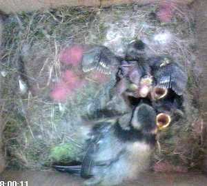I thought that this was a good picture to show a chick's growing wing feathers. As they arch their backs so that they can deliver their parcel of poo to a parent, they often also stretch out their wings.