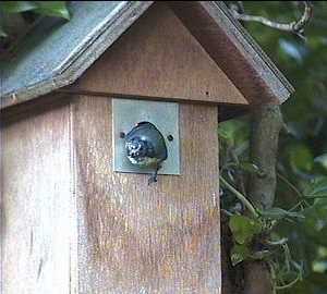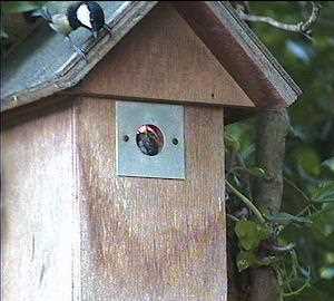 The great tit moves off and Barney is emboldened enough to come out of the nest box a bit. One look at his face would put anything off!