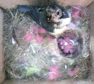 Sometimes when he comes into the nest, Fluffy is not there. Then he tries to persuade a chick to take the grub from him, making the same sort of clucking noise as Fluffy does if the chicks ignore him.