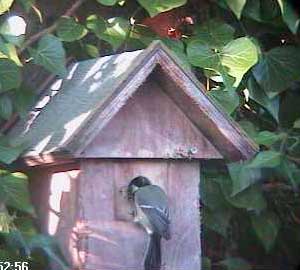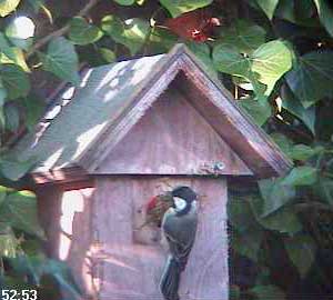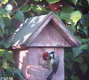Great tits are clearly bigger birds than bluetits. Here Babe has such a large amount of moss in her beak that she finds it difficult to get it through the hole! She actually falls off twice in the struggle!