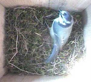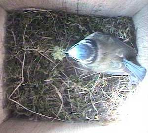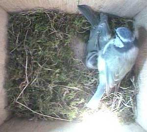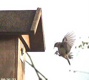 The first thing we see when we turn on on Saturday is Kelly bringing some more nesting material to the nest box.