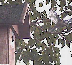 Here are some morning acrobatics. The bluetit has been perched on the roof and flies down to land on the entrance hole.
