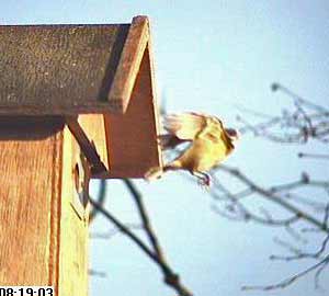 Earlier, the male had been looking out of the box for quite a while and here he had just popped up to take another look, when he suddenly had to beat a hasty retreat.