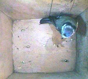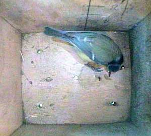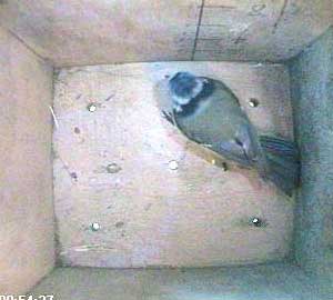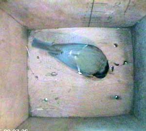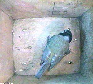 He had hardly left the box when the female returned. This time she clearly means business. Here she can be seen trying to remove one of the droppings. She is only partially successful as it appears to be stuck to the floor.
