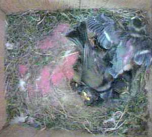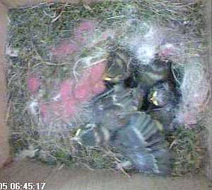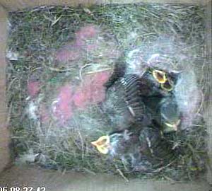 The chicks are clearly finding Kelly's nest cleaning activities a bit uncomfortable. Here one chick has almost climbed right out of the nest cup!