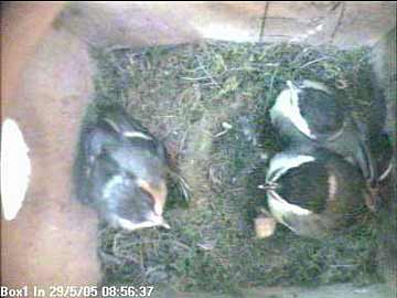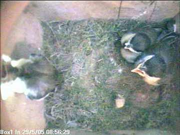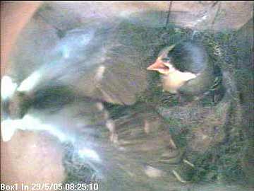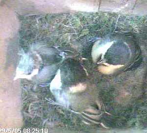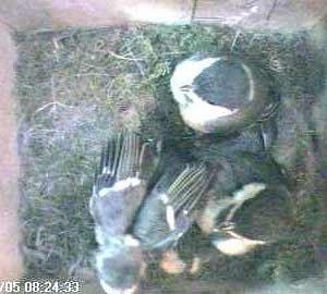 Now there were only three chicks in the nest box. Would the other two mature looking great tit chicks go, leaving Scrap by himself?