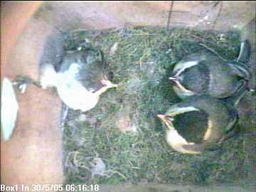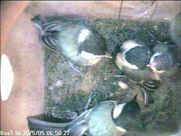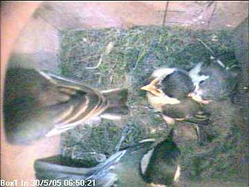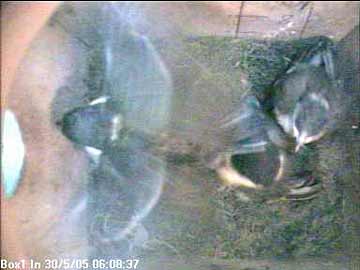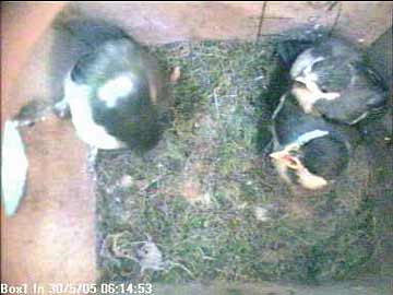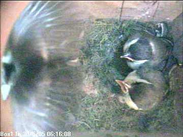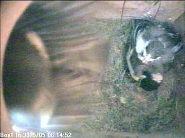 Here you can see one of the chicks looking out while Babe is in the nest box. The parents do appear to try to encourage their chicks to leave by, for example, calling from outside. Has Babe done anything here to prompt her chick to hop onto the hole?