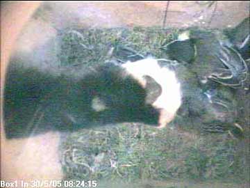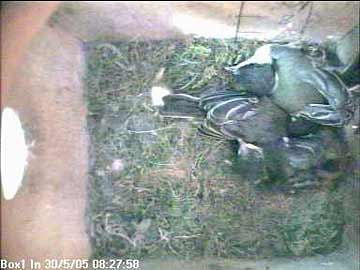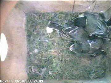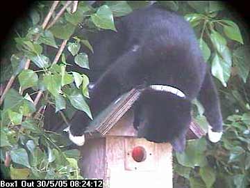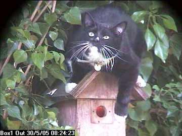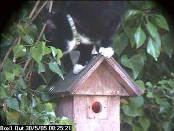 Elizabeth suddenly noticed something odd on the TV set which, as usual, was showing the inside of the nest box. From the record, we can now see that a cat was sitting on top of it.