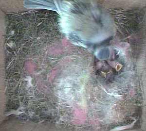 In spite of the fact that Kelly is covering part of the nest cup, you can again see 5 gapes. We think there are probably 6 chicks but we will have to be patient and wait until they are bigger before we can be sure!