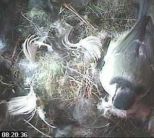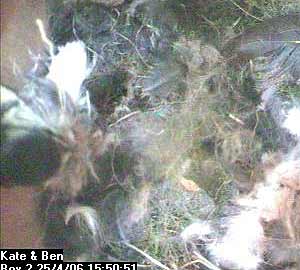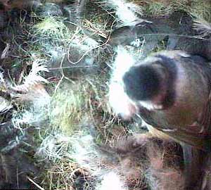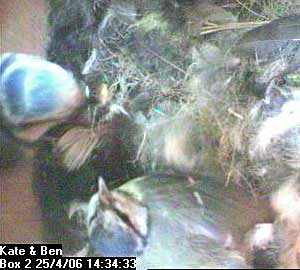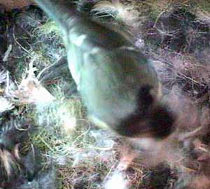 Of course being fidgety often means you are industrious - always on the go! That is certainly true of Kate. Although her nest box is pretty full, she is still bringing in feathers and other stuff. This time it's a small white feather.