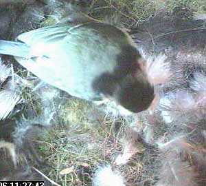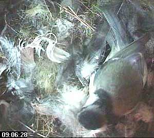 When she comes into the nest box with some feathers, she is constantly on the move. Most of the pictures the system takes are therefore blurred like this one.