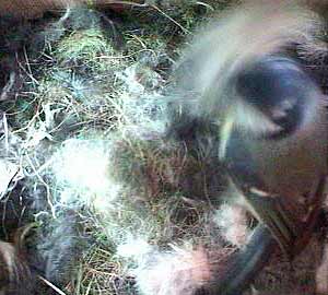 I don't think she can stop! The nest box is getting fuller and fuller with downy feathers, both black and white. She has more than enough for her chicks but for some reason she obviously feels compelled to collect more.