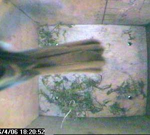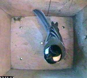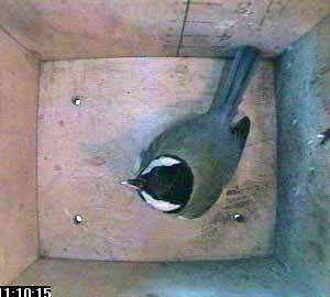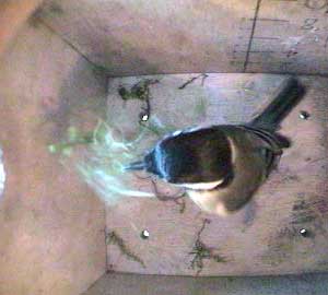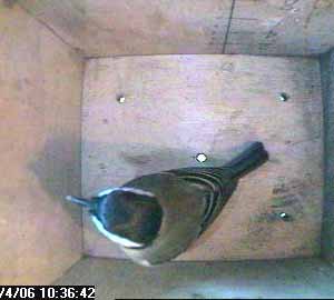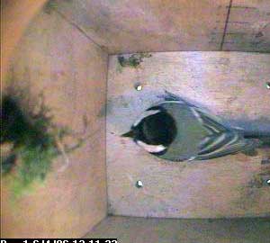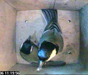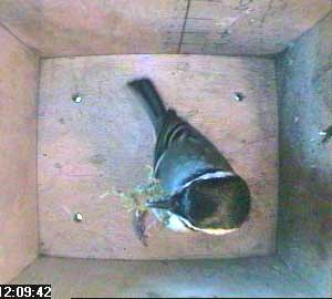 This shot was taken at 11:16. The great tit has been inside for about 40 minutes! That's the longest time we have seen inside an empty nest box.