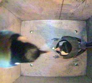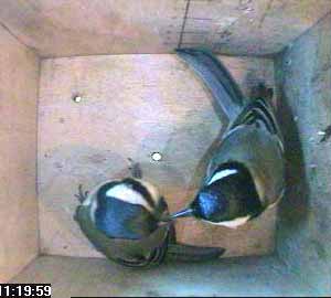 You can see that at the time the bluetit is perched on the roof, the great tit inside crouches down and faces the hole with its beak partly open. A defensive posture perhaps?