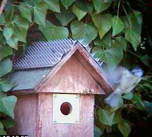 Then we realise the reason why. There is a bluetit on the roof of the box.