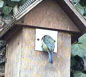 This is an example of the outside camera's pictures now it has been moved. It shows a bluetit entering the nest box.