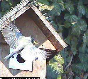It's now only about 6 or 7 minutes after the timid bird looked around and the bolder one is back with more nesting material - or is there only one female really?