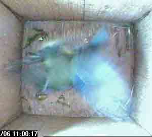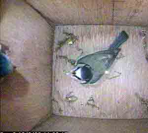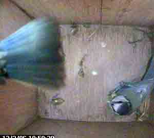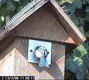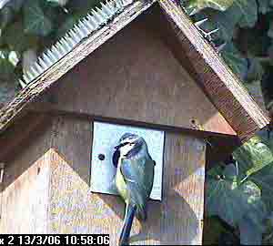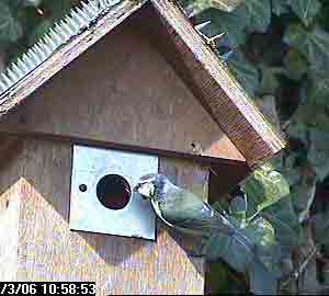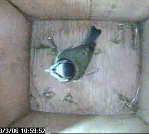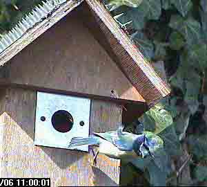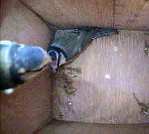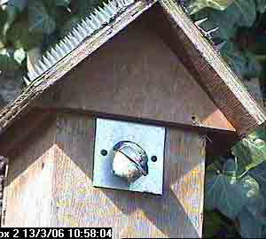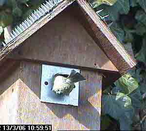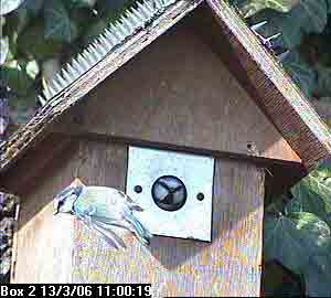 Finally, it went in. I think it must be the male. In the previous picture you can see that its head feathers are slightly raised and its behaviour once in the box is more typical of a male bird.