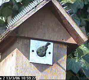 Immediately the bird first inside departs. This is typical if the two birds are male and female and have formed a partnership. The male has now left leaving the female in the nest box.