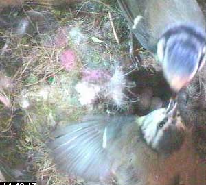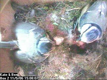So Kate moves across to feed the chicks and Ben leaves the nest box to get some more.