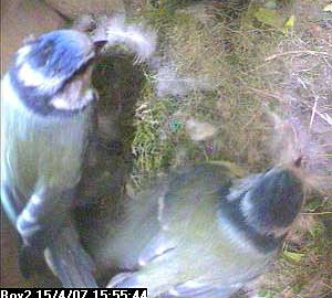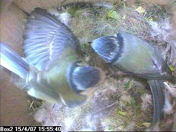 The whole sequence started in an unusual way with Morgan going into the box when Fay was not there. You can see it's Morgan from his streaky tousled head feathers.