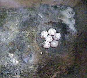 Abby has been keeping her eggs well hidden. This is a better view than most of the pictures we have of the empty nest. You can clearly see 4 eggs, the same number as yesterday. If she laid one this morning, she should have 5!