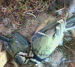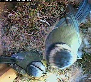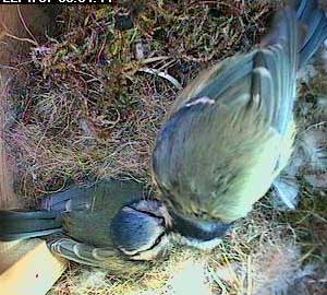 You can see that Abby's head feathers are smoothly laid back on her head whereas Angus's head feathers are rougher and his head band is wider. These characteristics become more apparent as the breeding season progresses to the point where many male bluetits will lose their head feathers altogether.