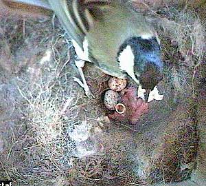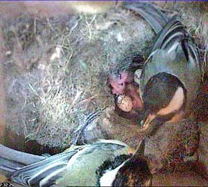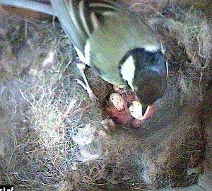 A minute later, Greta arrives with some more food. Interestingly, she feeds the chicks that had hatched earlier before she attends to the chicks that are emerging from their eggs now.