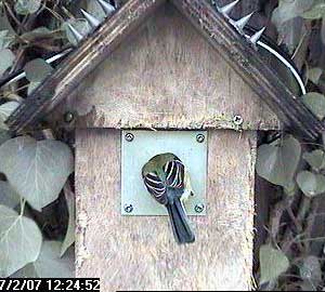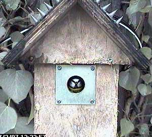 But the male has had enough and pushes past the female on his way out of the nest box. This is only 4 seconds after she jumped onto the nest box hole, so he is being pretty impatient here!
