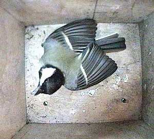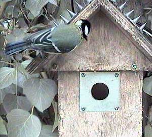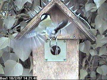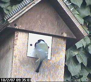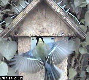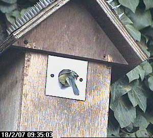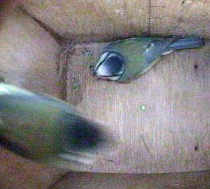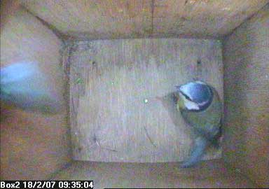 Here you can see the outside bird entering the box from the inside camera. See how the inside bird has positioned itself on the floor of the nestbox so as to be as much out of the incomer's way as possible.